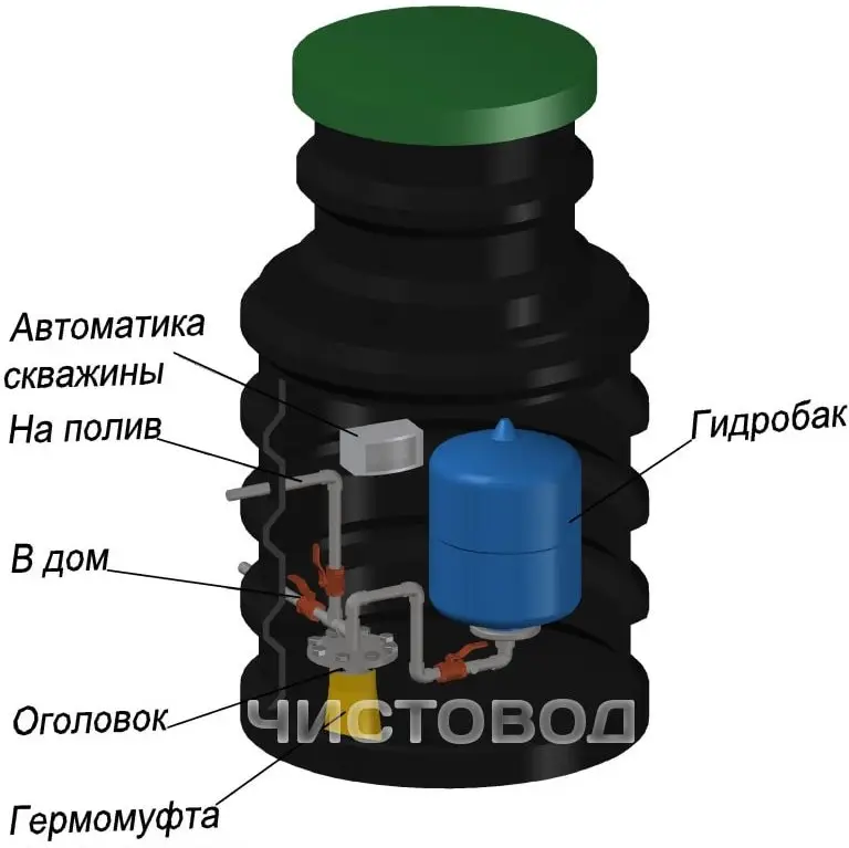 Кессон «Чистовод-1100» применяют для обустройства скважины и подключению её к дому. Габаритные размеры кессона позволяют установить внутри: оголовок скважины, трубопроводную обвязку, гидробак объемом 80-100л. и управляющую автоматику.