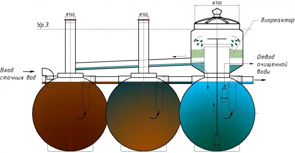 Принцип очистки основан на биореакторной очистке: отстоявшиеся и осветленные стоки, подаются насосом в биореактор, где происходит распыление стоков на биозагрузку с бактериями, с помощью которых и осуществляется глубокая очистка.